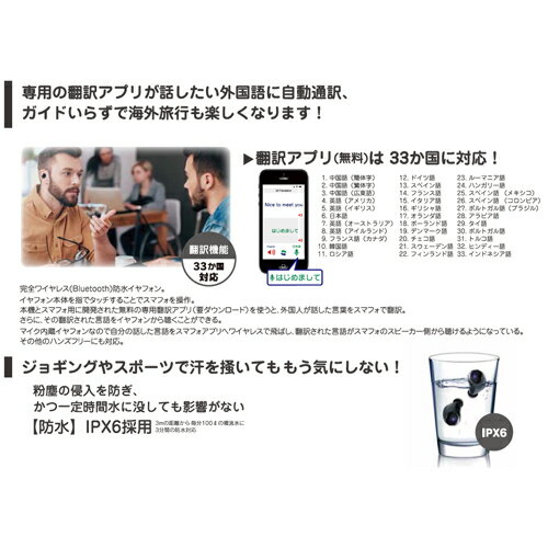 ◆「防水機能 IPX6 ◆イヤホン待受け時間約120時間 ◆充電ケース待受け時間約400時間 ◆イヤホン充電時間約1時間30分 ◆充電ケース充電時間約2時間 ◆連続通話・音楽再生時間約5時間 ◆イヤホンバッテリー容量3.7V 50mAh ◆充電ケースバッテリー容量3.7V 350mAh ◆イヤホンサイズ 28x26x23mm ◆充電ケースサイズ 56x32x53mm ◆イヤホン重量約16g ◆充電ケース約50g専用アプリで同時翻訳も出来るワイヤレス Bluetooth イヤホン 音楽再生 通話 同時通訳